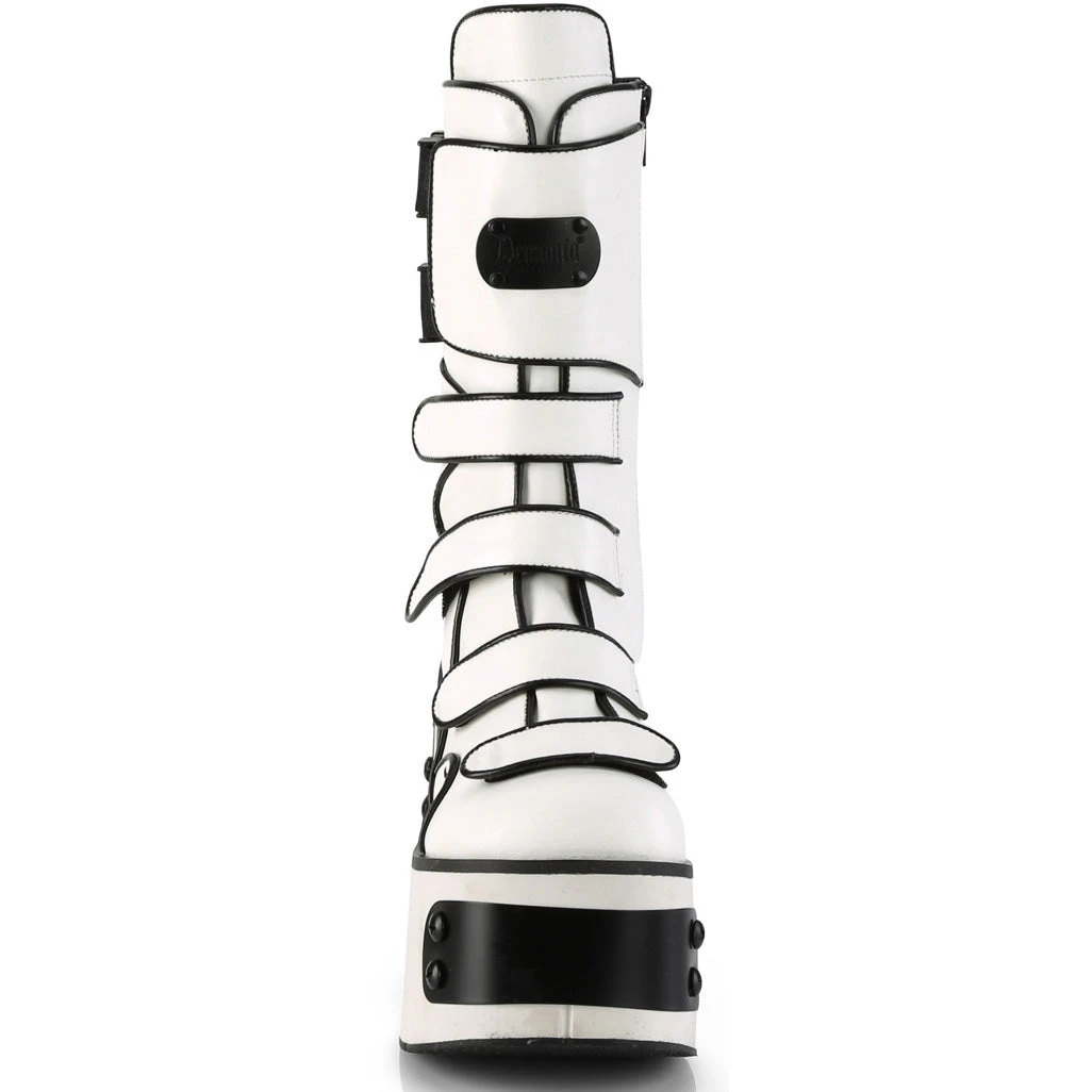 4 1/2″ (114mm) Front and Back Metal Plated Platform Strappy Mid-Calf Boot Featuring Front Shield with Branded Metal Plate Center Detail and Dual Snap Buckles and Hook and Loop Straps on the Remaining Straps, Full Length Inside Metal Zip Closure.