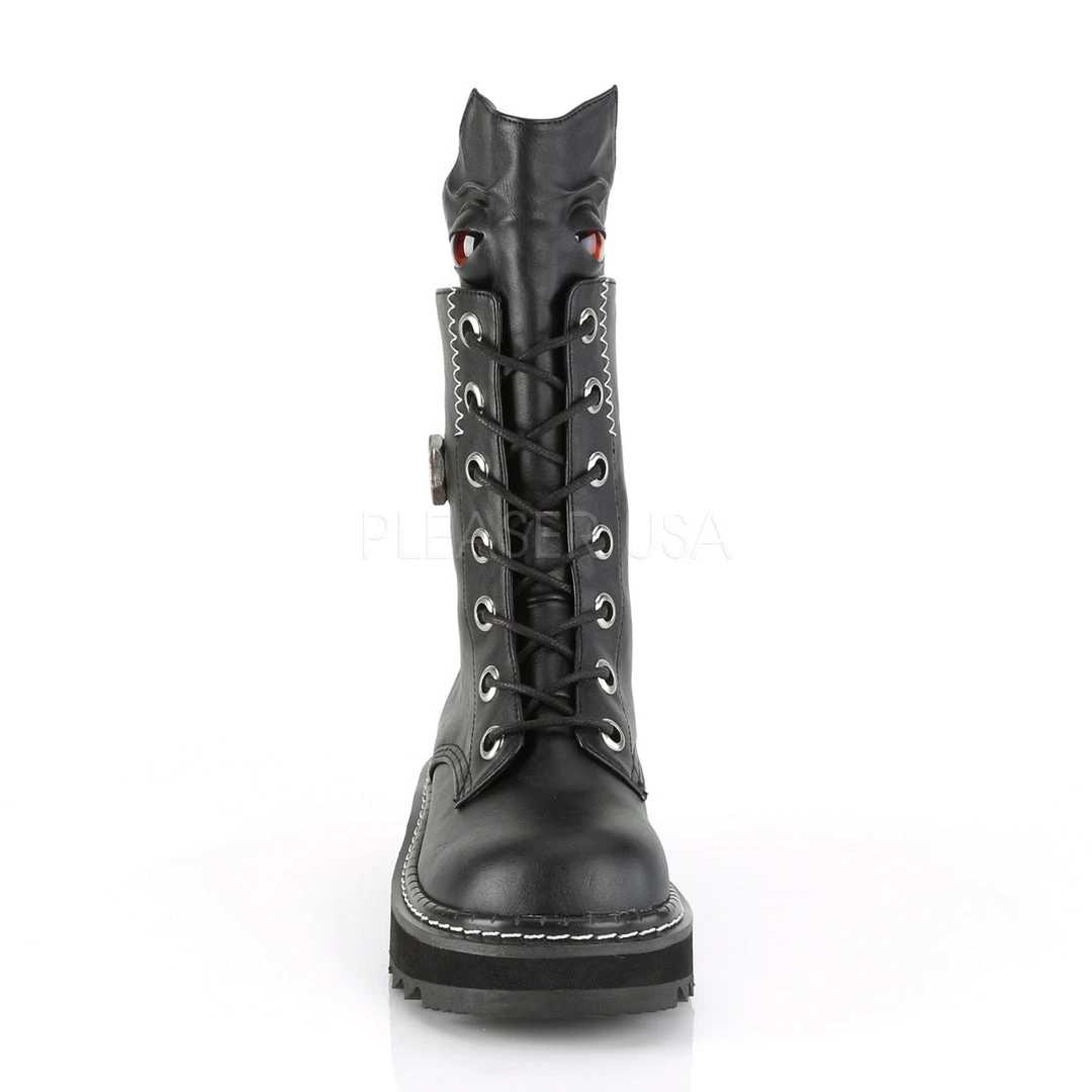 1 1/4″ (32mm) Platform Lace-Up Mid-Calf Monster Boot Featuring Eyeball Adorned on Coffin Shaped Tongue with Metal Bolt and Contrast Stitching Details, Back Zip Closure.