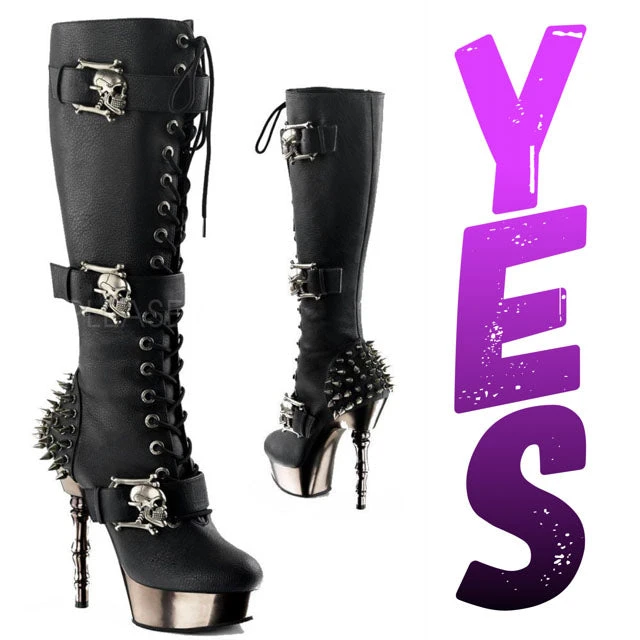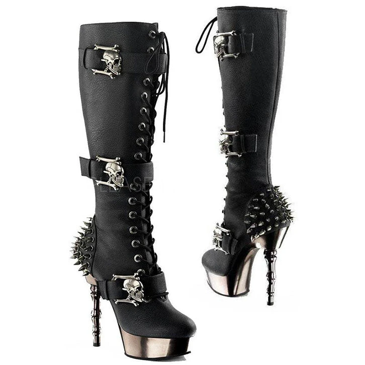 Black leather effect boots with triple skull buckle straps, front lacing with metal eyelets, spike heel decoration, bone effect metal heel and metal reinforced sole. Side zip fastening