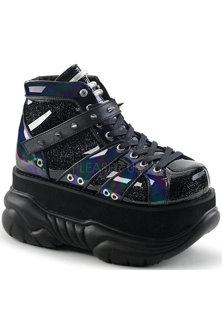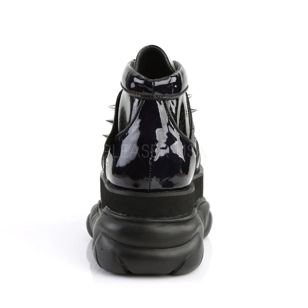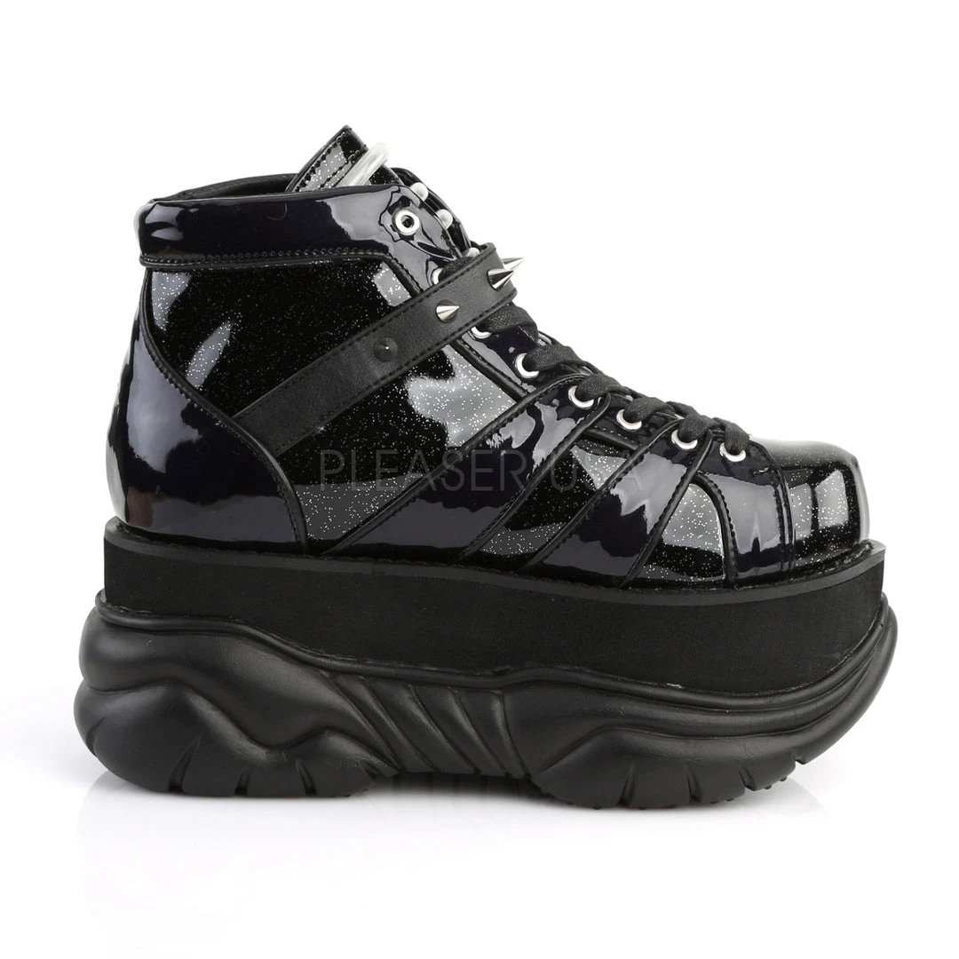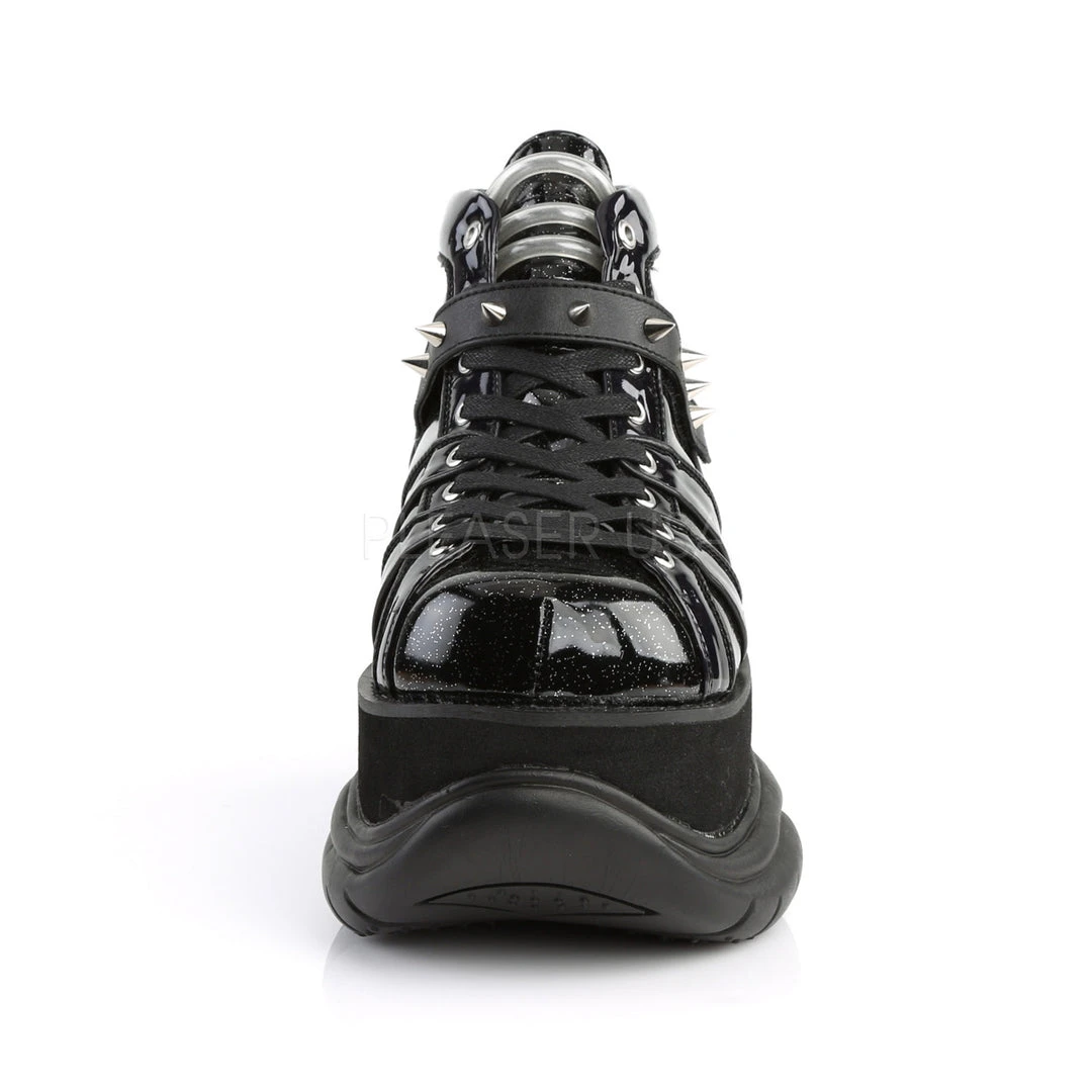 3″ (76mm) Platform Lace-Up Shoe Featuring Hook N’ Loop Ankle Strap with Cone Studs and UV Reactive Tubbing on Tongue.