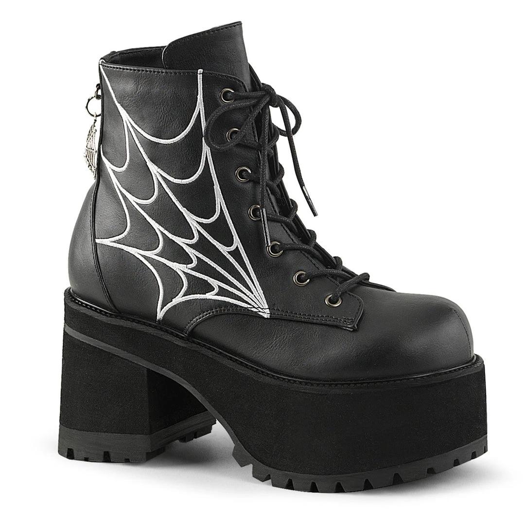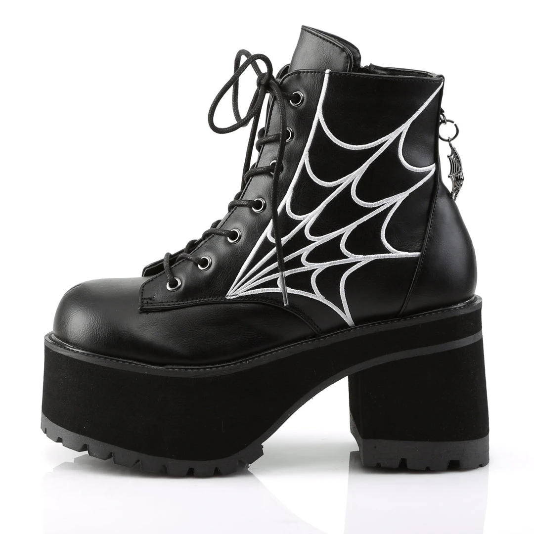 Black leather effect ankle boot with four inch block heel and two and a half inch platform sole. White cobweb design on side of boot, and Spiderweb Charm at back. Front lacing.