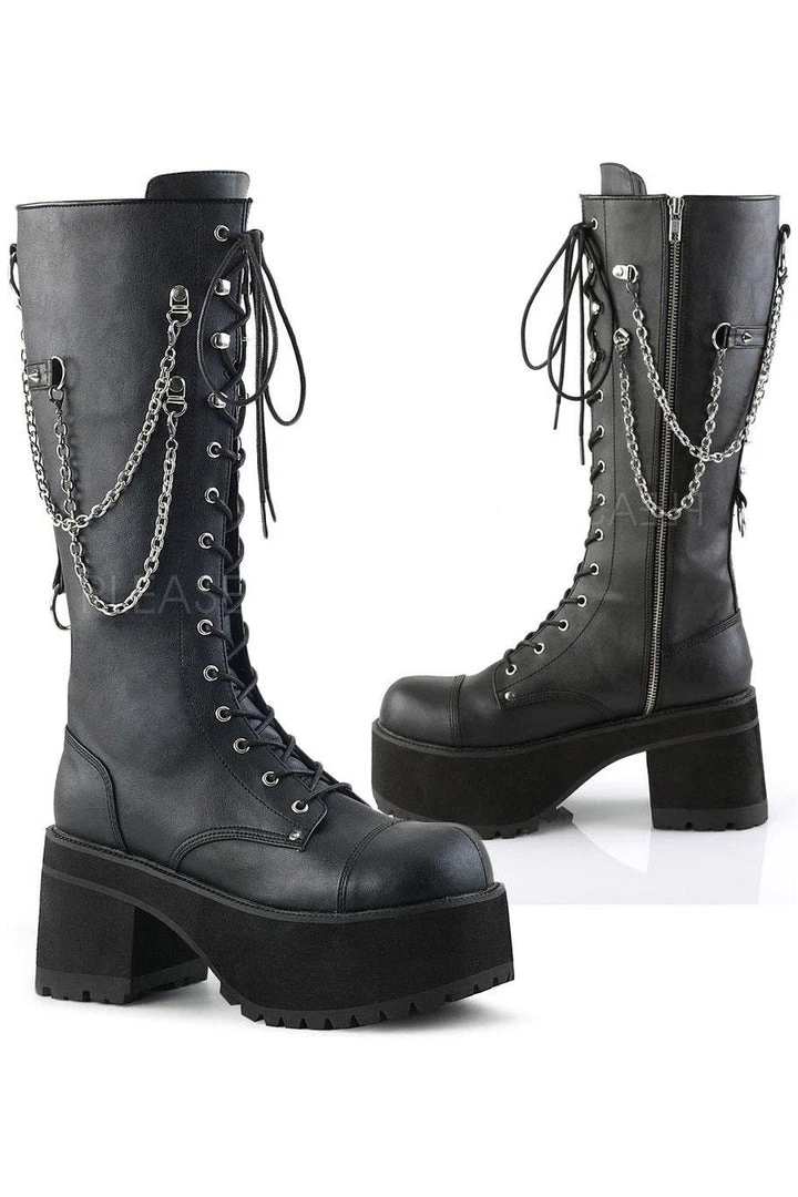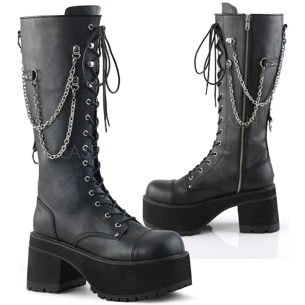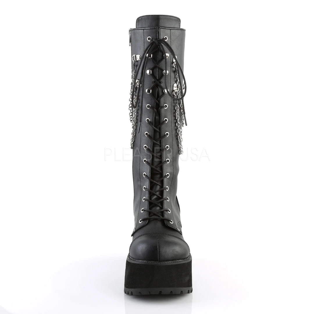 3 3/4″ (95mm) Heel, 2 1/4″ (57mm) Platform Lace-Up Front Knee High Boot Featurning Silver Chains and Studded Back Strap with O-Rings, Inside Zip Closure.