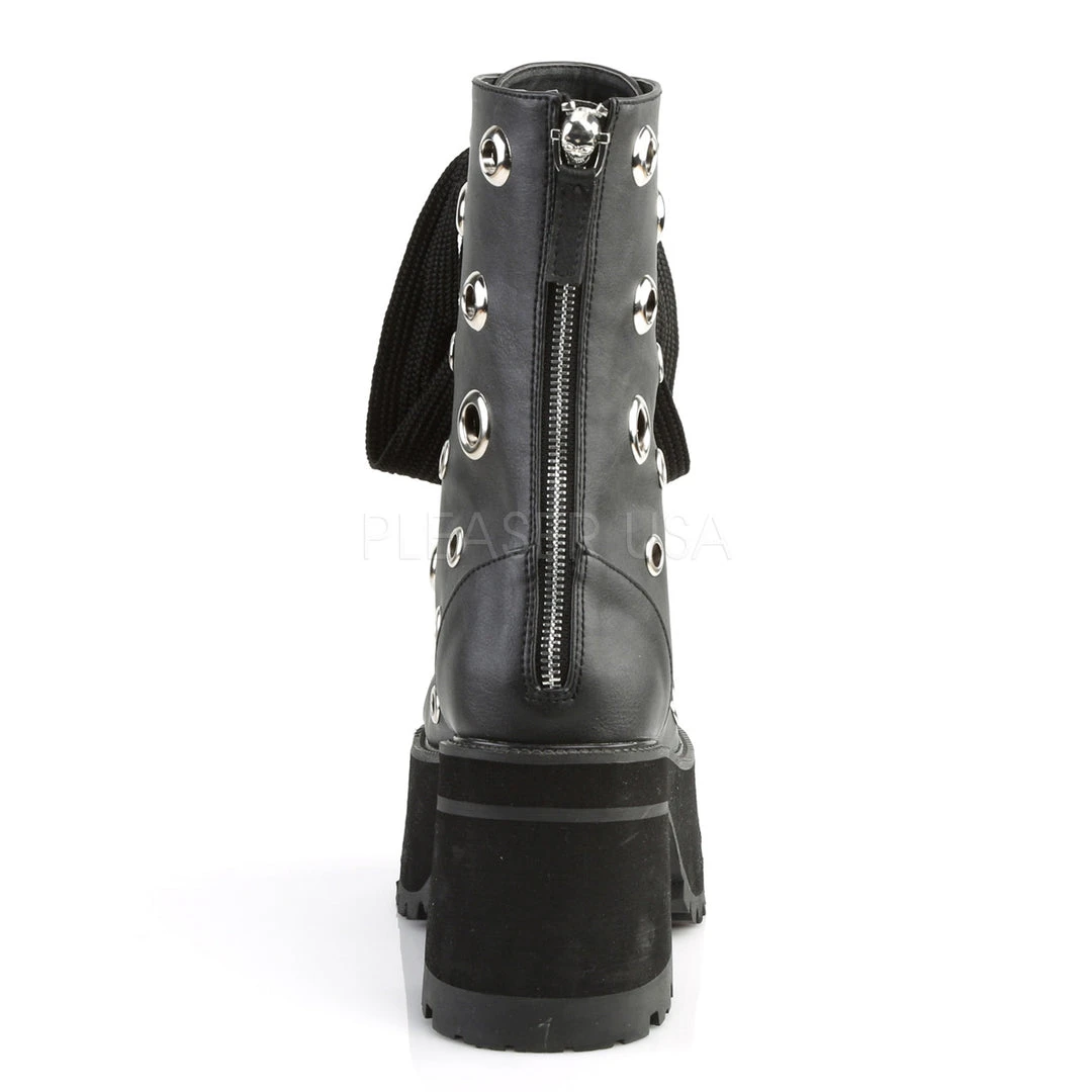 3 3/4″ (95mm) Heel, 2 1/4″ (57mm) Platform Lace-Up Front Ankle Boot Featuring Multi-Size Eyelets on Upper, and 1″ Wide Shoe Lace, Back Zip Closure with Skull Zipper Head.