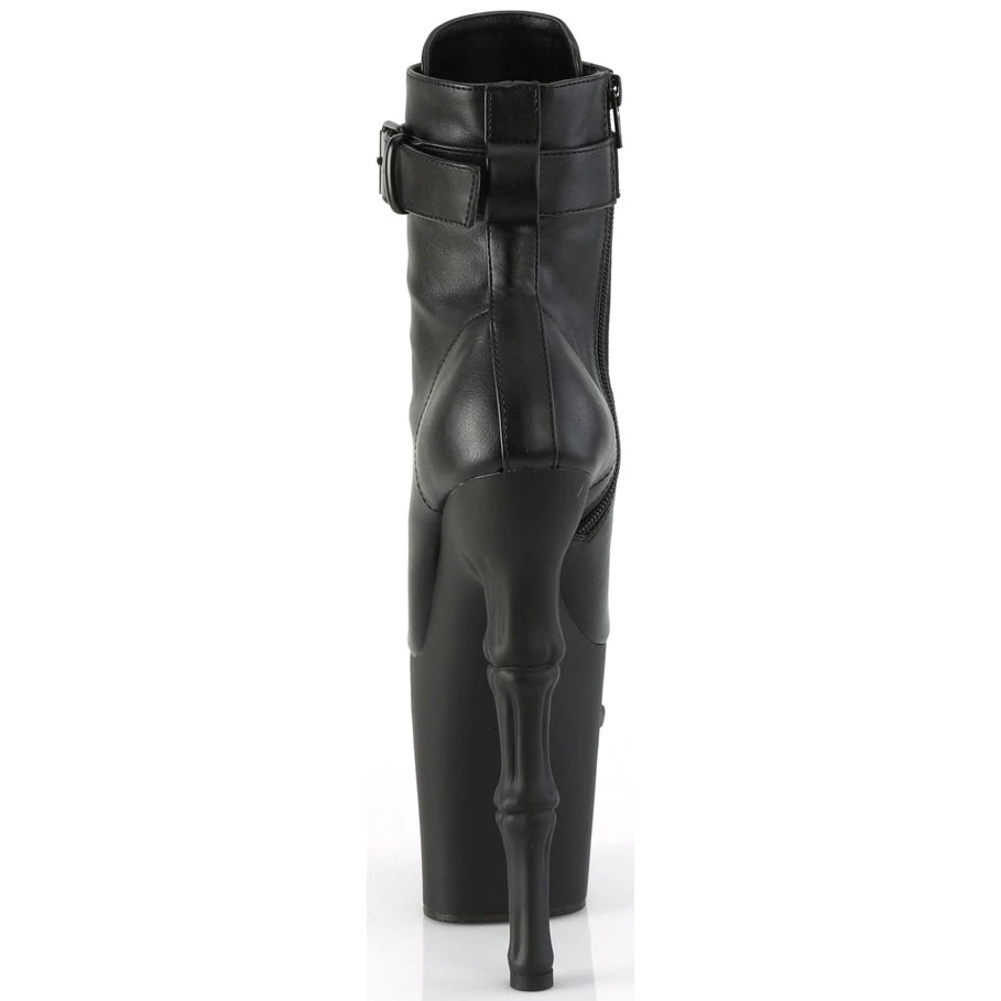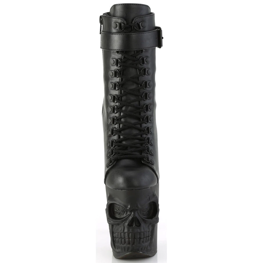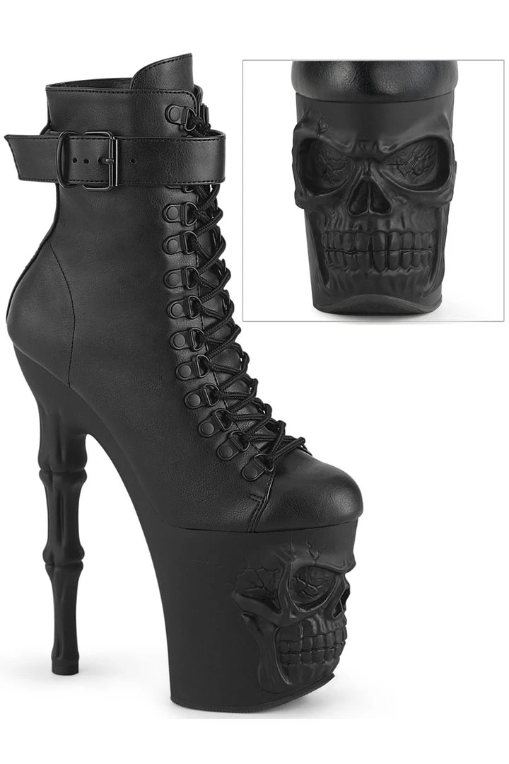8″ (200mm) Finger Bone Heel, 4″ (100mm) Skull Sculpted Platform D-Ring Lace-Up Front Ankle Boot with Buckle Strap, Inside Zip Closure.