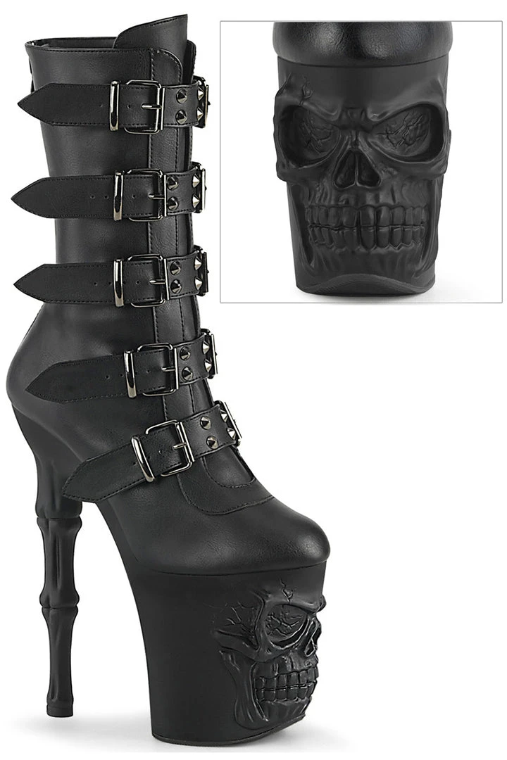 8″ (200mm) Finger Bone Heel, 4″ (100mm) Skull Sculpted Platform Mid Calf Boot Featuring Multi Metal Spike Adorned Buckle Straps, Inside Metal Zip Closure.