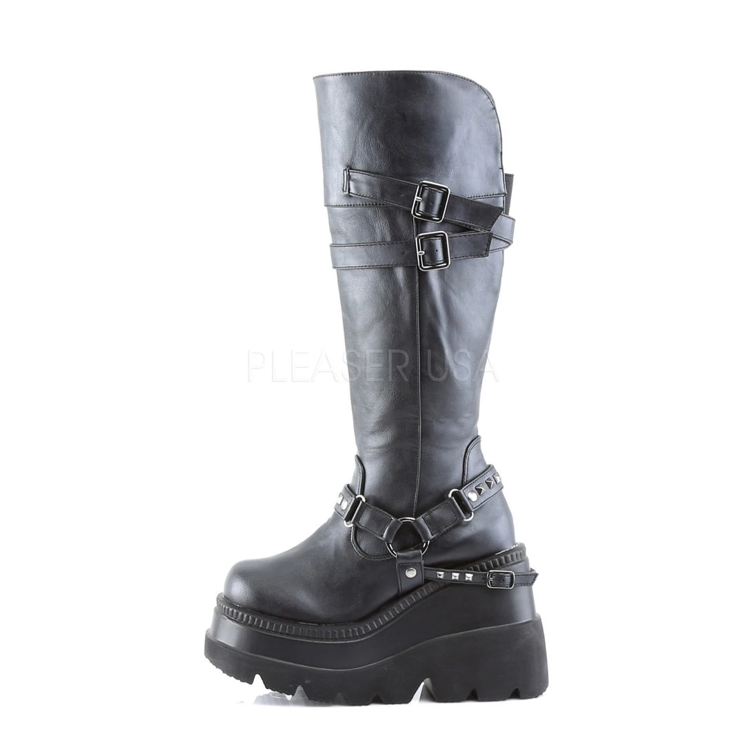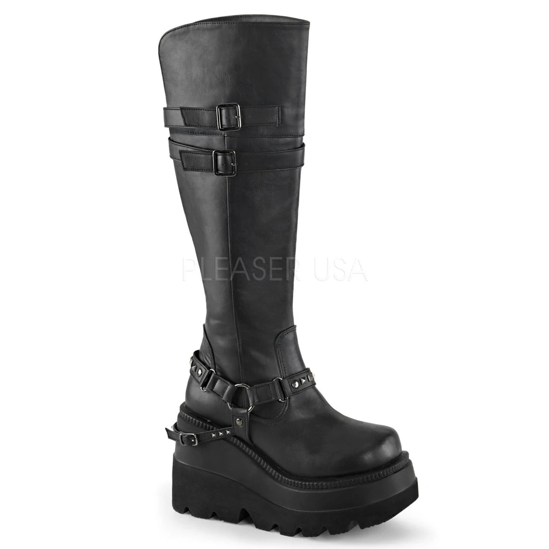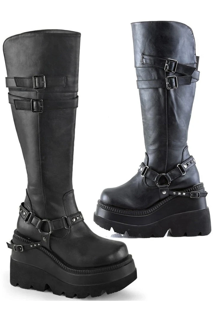4 1/2″ (11.4cm) Stacked Wedge Platform Knee High Boot Featuring Top Stitching at Layered Vamp, Wrap Around Buckled Straps and Studded Ankle Straps with O-Ring Detail, 2/3 Length Inside Zip Closure.