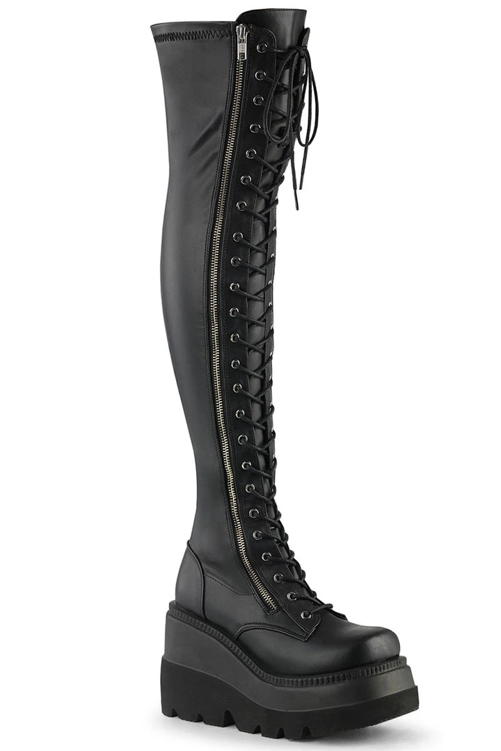 4 1/2″ (114mm) Wedge Platform Lace-Up Stretch Thigh-High Boot, Full Length Outside Metal Zipper.