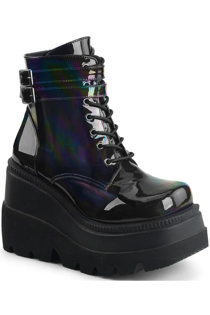 Demonia Ladies Black Hologram Stacked Wedge Platform Boots SHAKER-52.