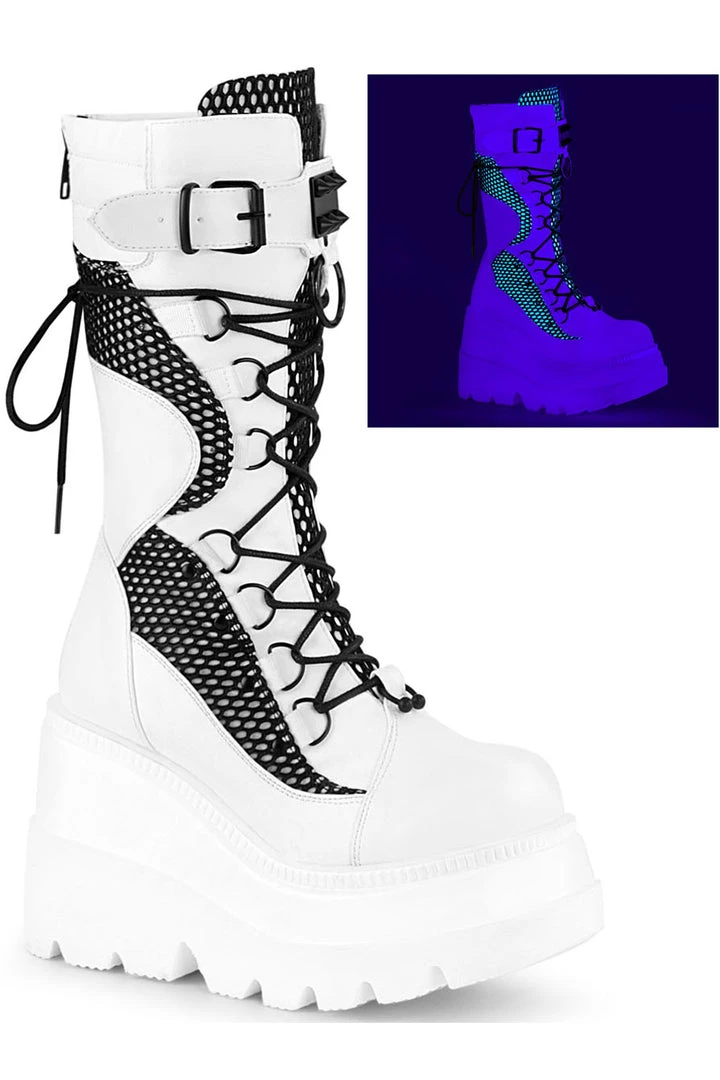 Demonia Shaker 70 White Vegan Leather with Black Fishnet Boots.