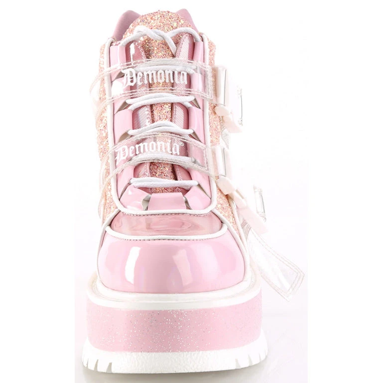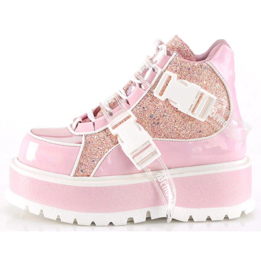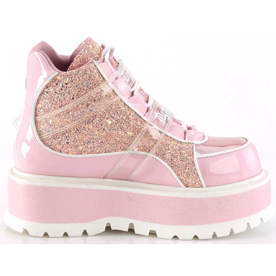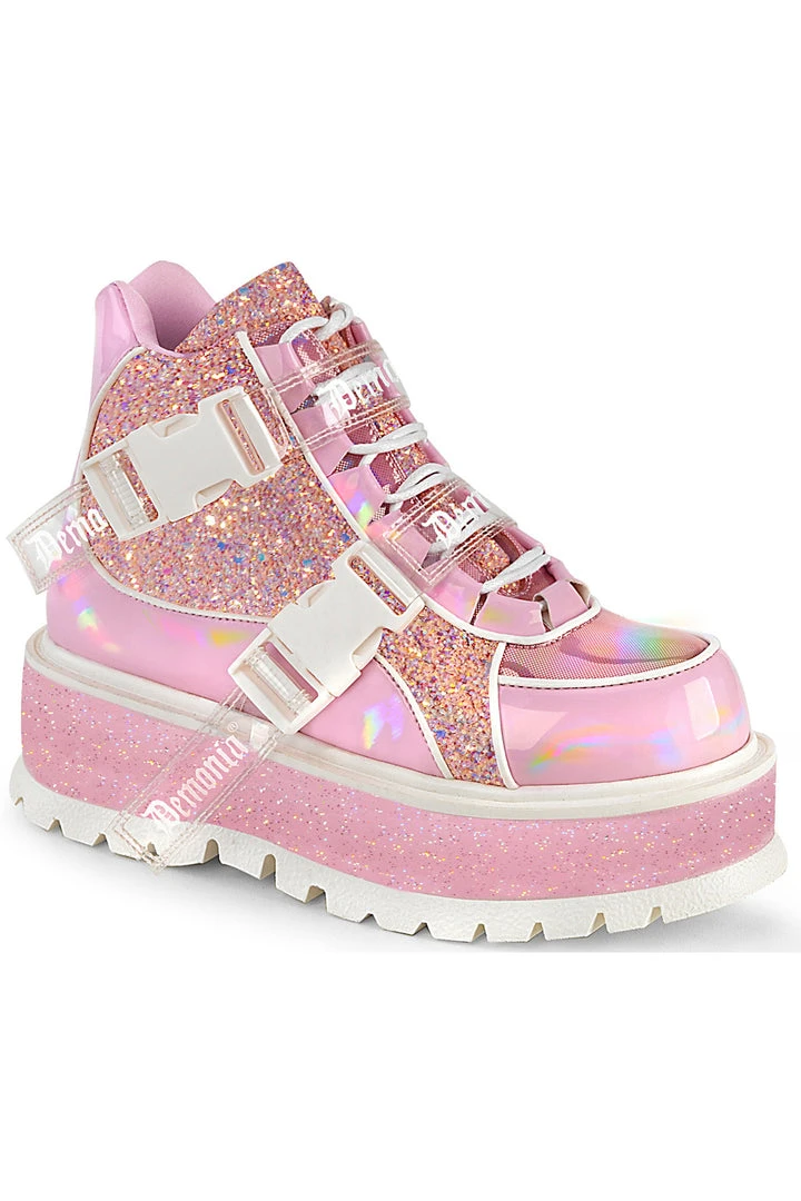 Demonia SLACKER 50 Pink Holographic Patent Pink, Multi Glitter Boots.