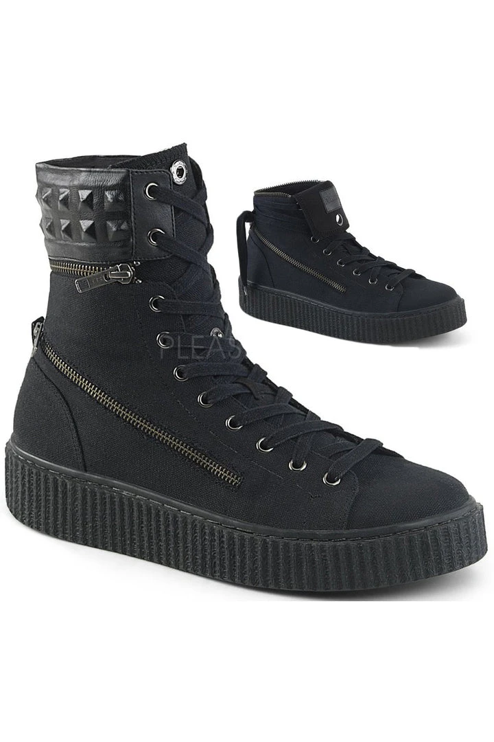 1 1/2″ (38mm) Platform Rubber Sole High Top Round Toe Lace-Up Front Creeper Sneaker Featuring Stud Embossed Removable Padded Collar, Fold Down Snap Tongue and Metal Zipper Design.