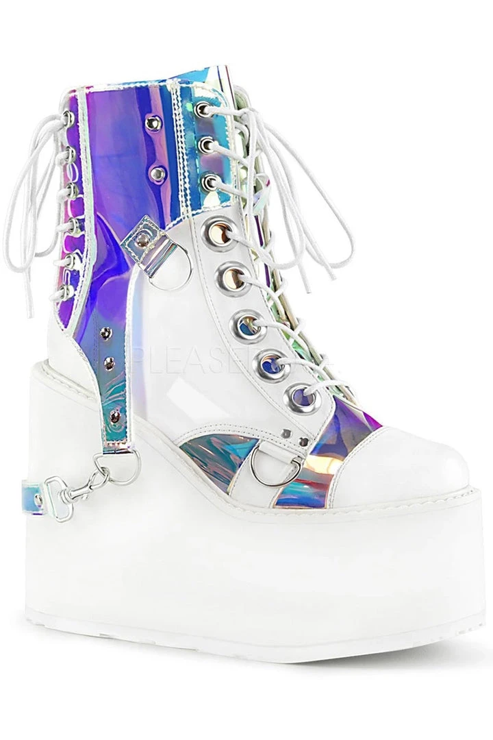 Demonia Ladies White Vegan Leather with Patent PVC Magic Mirror Decoration SWING-115 Boots.