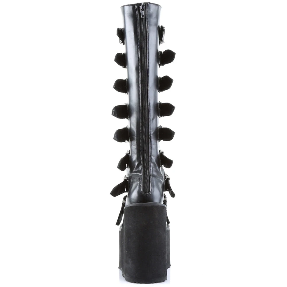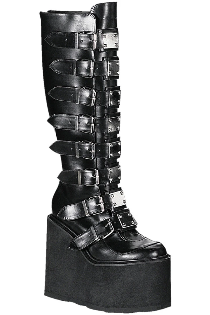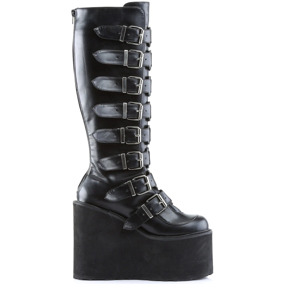 Swing 815 Black Leatherlook Matte PU knee boots with eight double buckle straps with riveted metal front plates, three inch platform sole with five and a half inch platform heel and back zip fastening.
