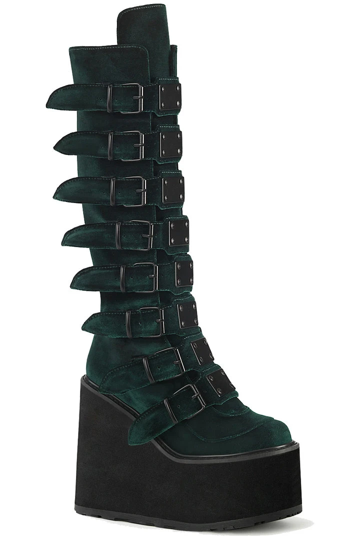 Demonia SWING 815 Emerald Velvet Boots. Green.