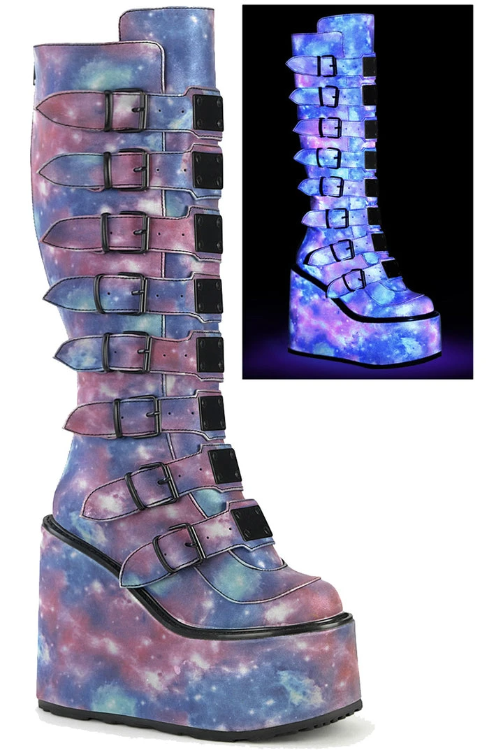 5 1/2″ (140mm) Platform Knee High Boot Featuring 8 Buckle Straps with Metal Plates at Center, Back Metal Zip Closure. Galaxy effect pattern design.