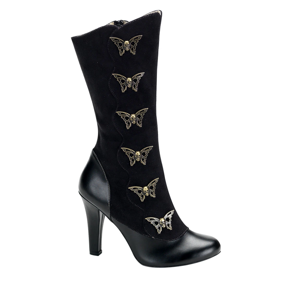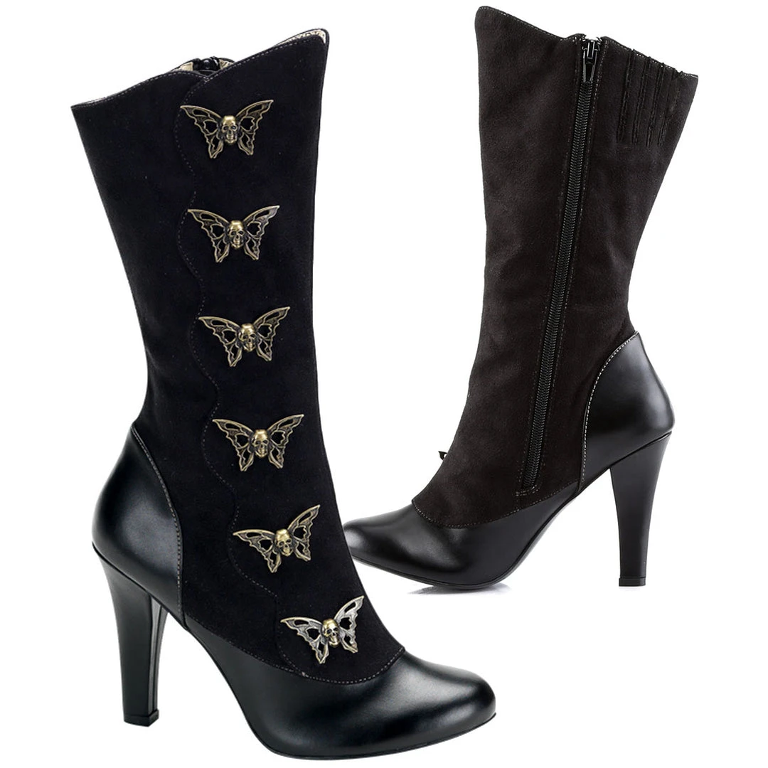 Black leather effect and suede effect calf boot with four and half stiletto heel. Six decorative skull butterflies in bronze effect finish, side stretch panel for adjustable fit and side zip fastening.