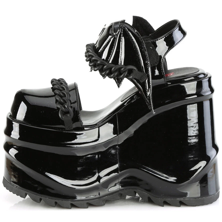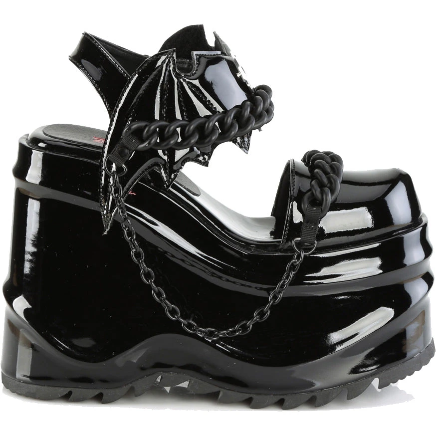 6″ (152mm) Wedge Platform Close Toe Ankle Strap Sandal Featuring Bat Shaped Hook and Loop Ankle Strap Closure, Moon and Chain Details.