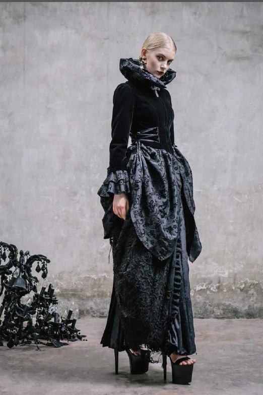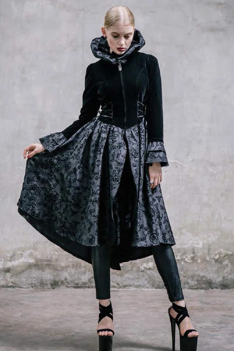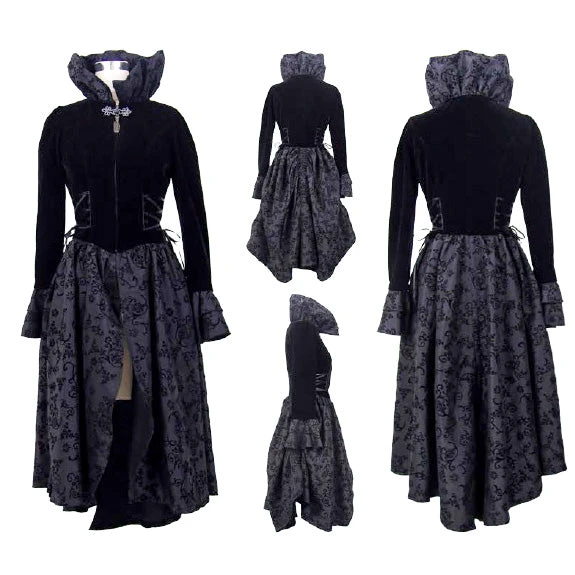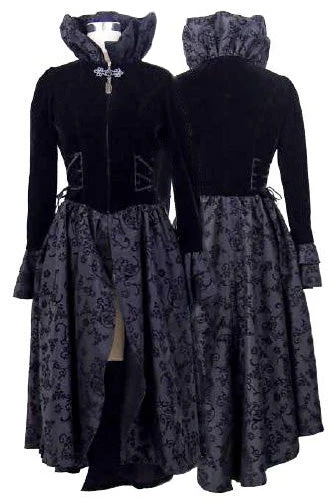 Sumptuous Coat with Brocade and Velvet Touches, Stand Up Style Collar has Taffeta and Velvet Brocade which helps it to keep its shape, zips up at the front. The Skirt portion of the coat has similar brocaded fabric to the collar but is not so stiff. The Main body of the top half of the Coat is in velvet at the sides there is corset ribbon lacing.
