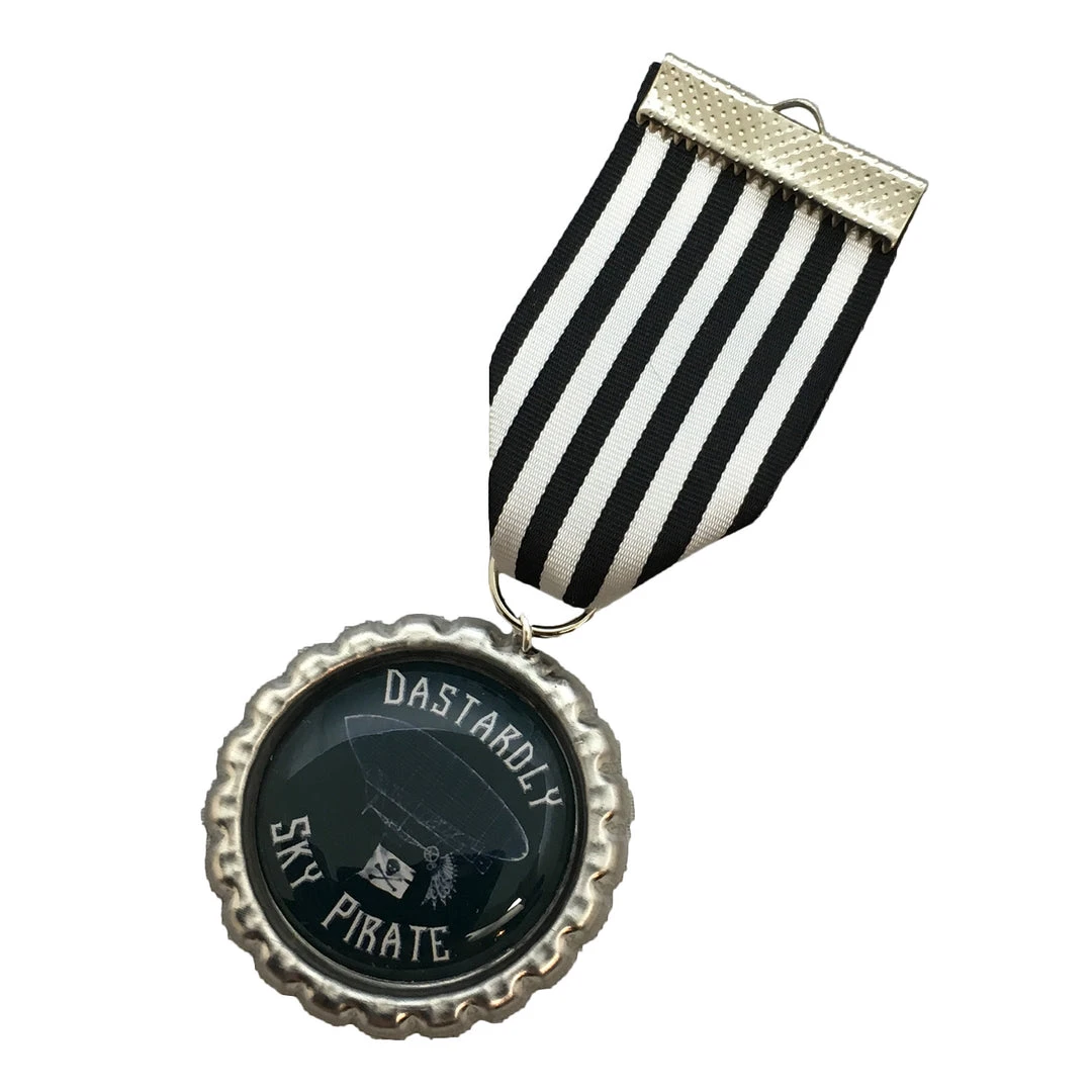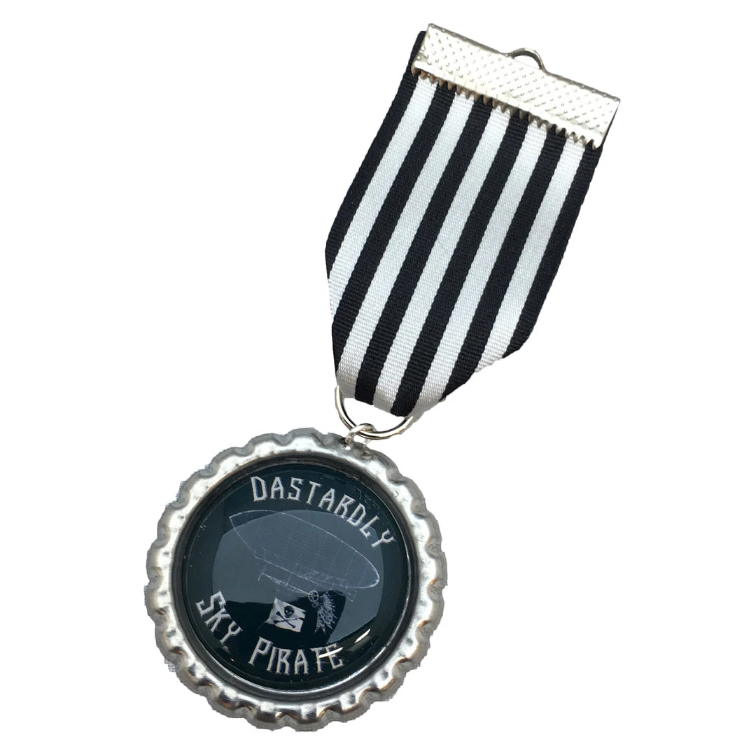 Hand crafted Steampunk medal with black and white striped ribbon featuring Dastardly Sky Pirate.