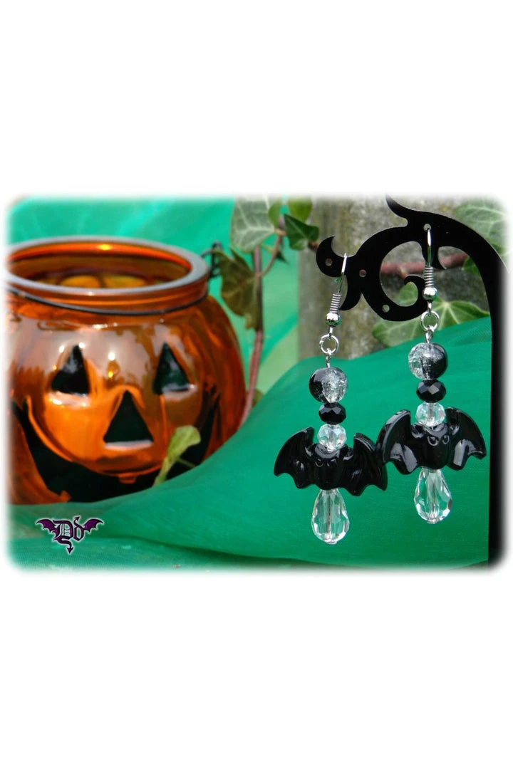 Dragophelion Designs Halloween Gothic Bat Earrings. Pair of silvertone Hook Earrings featuring a black acrylic bat bead flying over a clear crystal style faceted glass teardrop bead, with glass crystal rondelles in clear AB and black above, topped with a two tone shimmering glass crackle bead with black on one side and a silvery clear tone on the other, reminiscent of the moon phases as it turns.