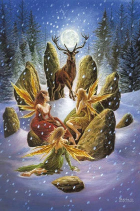 Beautiful Card with the artwork of Fantasy Artist Briar of a Stag in a forest clearing encountering some fairies by moonlight. Comes with festive red envelope and with “Yuletide Greetings” inside. Printed on FSC accredited paper with vegetable based ink by a printer who conforms to all ISO standards. Tree Friendly.