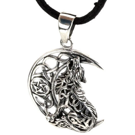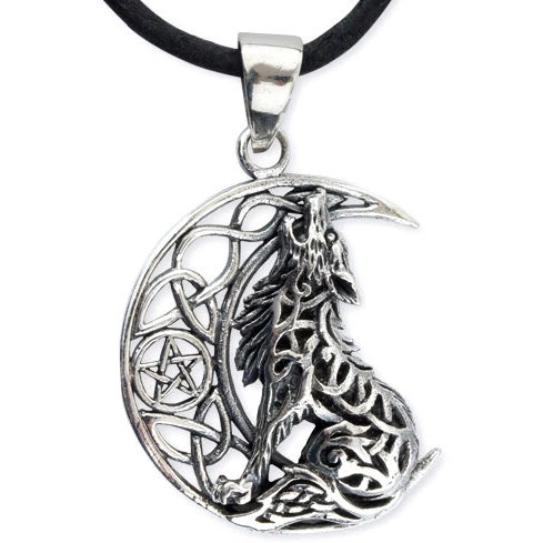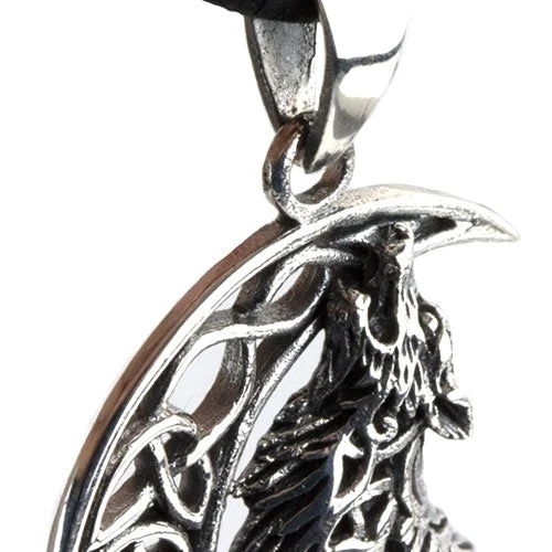Sterling Silver pendant howling wolf in moon with celtic design.