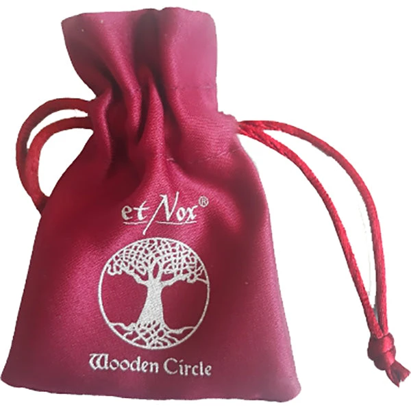 Wooden frame with rivets and runes, the runes stand for the 4 cardinal points: north, south, east, west motive inside: knot of Wotan made of stainless steel including black leather strap with stainless steel clasp (ca. 48 cm + 7 cm extension). All items of the etNox Wooden Circle – collection come together with a satin pouch.
