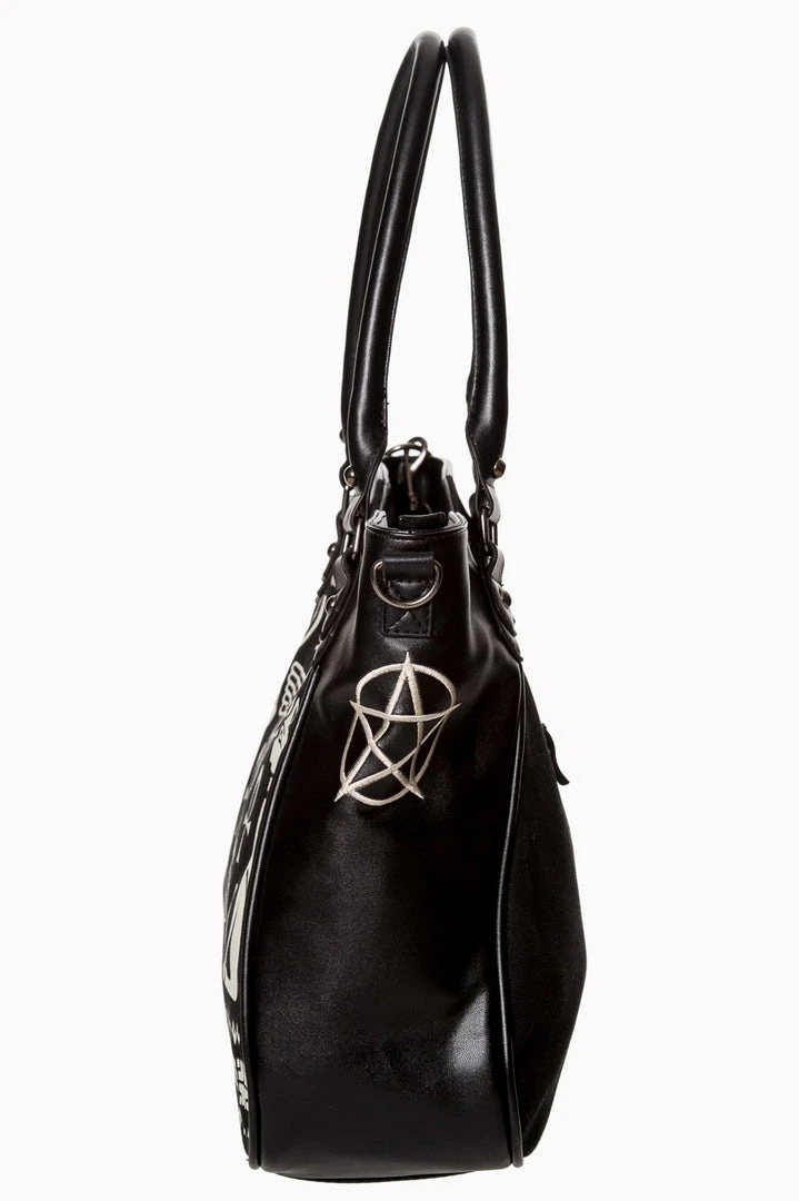 From Banned Alternative Wear this great Gothic hand bag in black canvas with faux leather look matte PVC side panels features a white print on the front with Egyptian symbols and each end has a pentagram embroidered in white. The bag has a central zip to the main compartment, inside which there is small zip pocket and open pouch pockets on the inside of the bag and the bag also has a small zip pocket on the back. The bag has faux leather carrying handles and also a detachable clip on leather look shoulder strap which clips to a d-ring at each side of the bag.