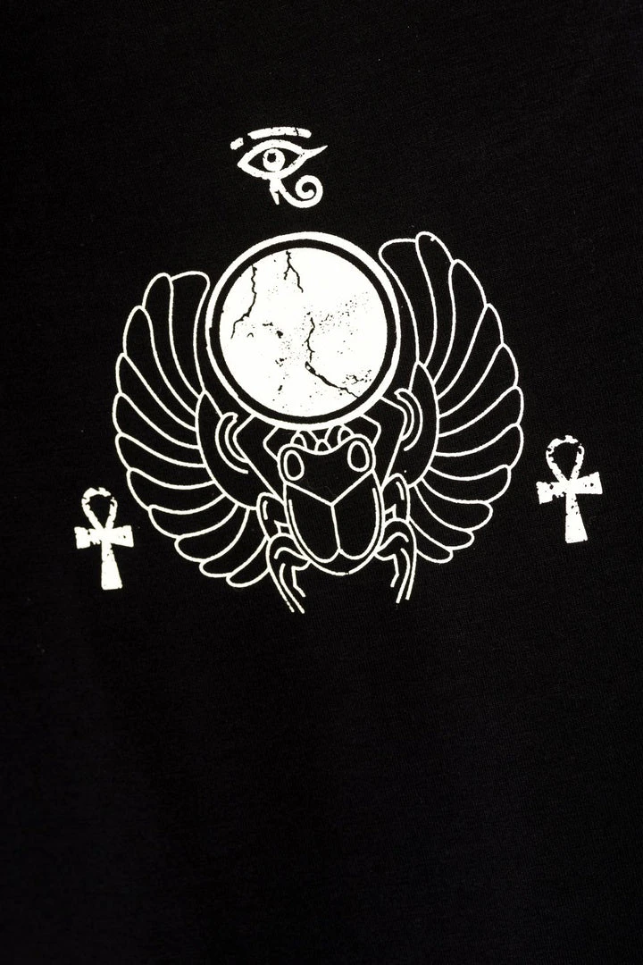 This cute goth top features a Siamese style cat head with moon phases and Egyptian style imagery around it. The back of the top has a small scarab beetle print design on the upper back. The top has shoulder cut outs, making it great for summer – airy like a strappy vest top but with a little arm cover!
