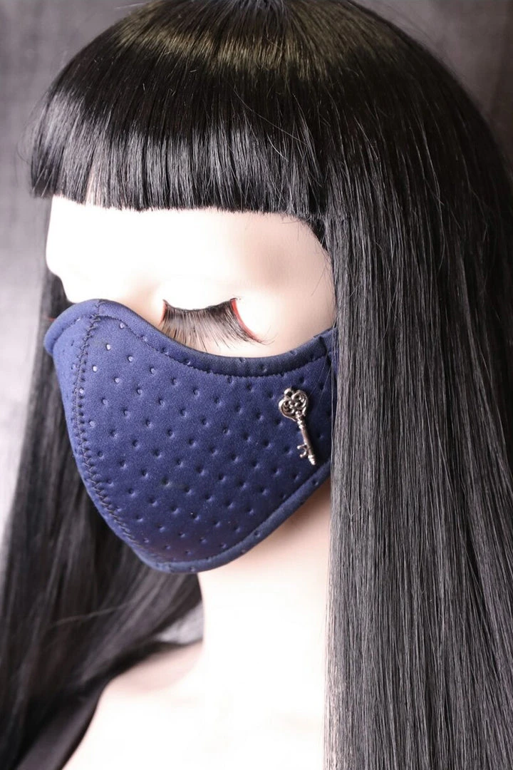 Handmade neoprene face mask decorated with filigree silver metal key pendant on one side.