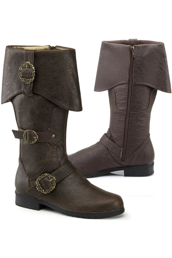 Funtasma Mens Brown Distressed Leather Effect Pirate Cuff Boots with three adjustable straps with gold effect octopus buckles. Full inside zip for ease of wearing, classic Pirate Cuff Boots styling, 1 inch heel.