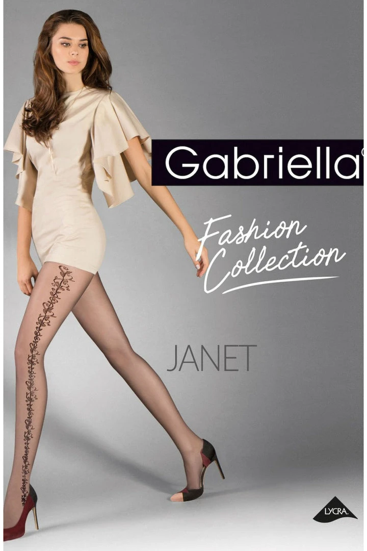Janet is an exclusively fancy pair of tights with a floral pattern down the leg, manufactured from Lycra fibres double braided with polyamide. Sewn with a flat seam, cotton gusset and toes are invisibly reinforced. 20 denier. The finishing touch is the packaging; luxurious feel and touch, with a representation of the product on the front branded with ‘Fashion Collection’ font.