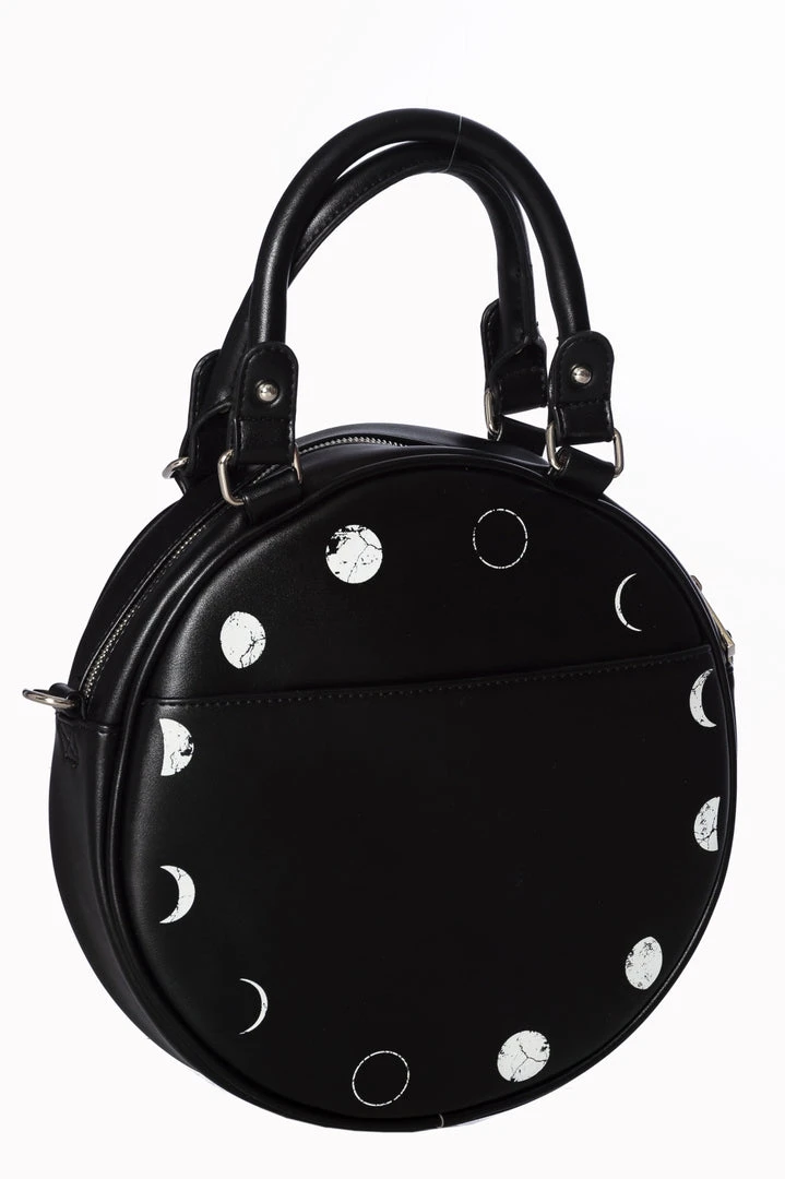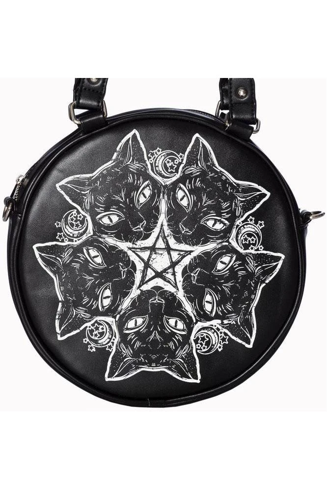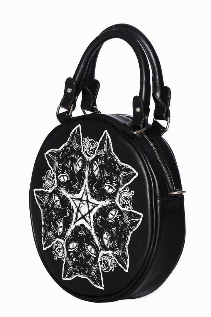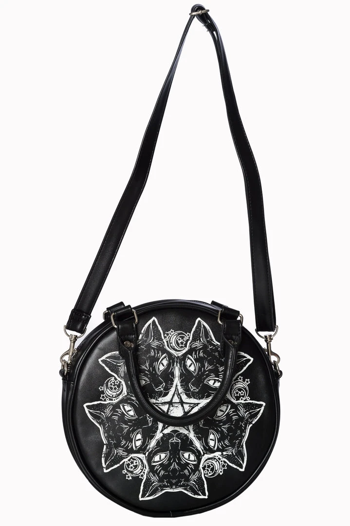 Banned Esotericat Hand Bag, Circular Handbag in black faux leather with Adjustable Shoulder Strap.