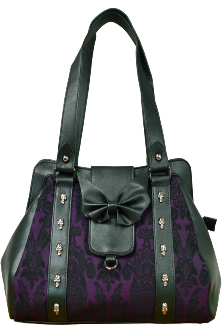 Purple Flocked Gothic Style Handbag with Bat Bow Detail.