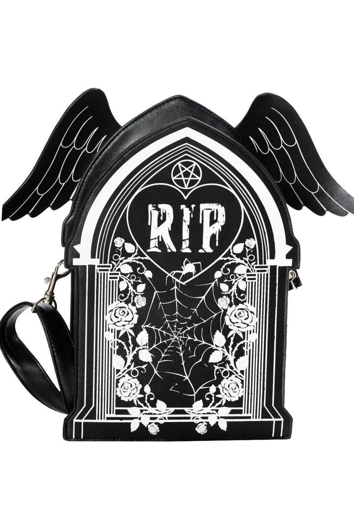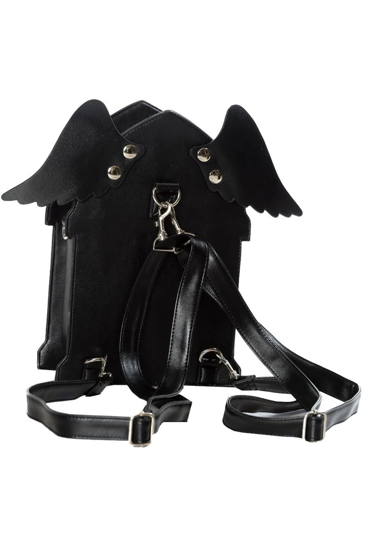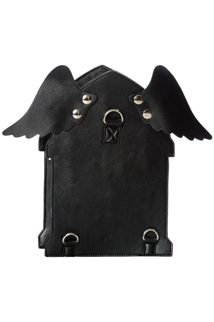 Banned Sleepwalker Backpack, Gothic Tombstone Bag with RIP design and detachable Angel Wings.