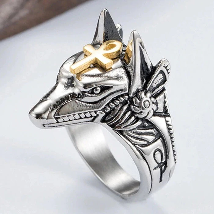This great Anubis Ring in silver tone metal features the head of the Egyptian God with an ankh on each side of the ring band and gold tone ankh on the top of his head.