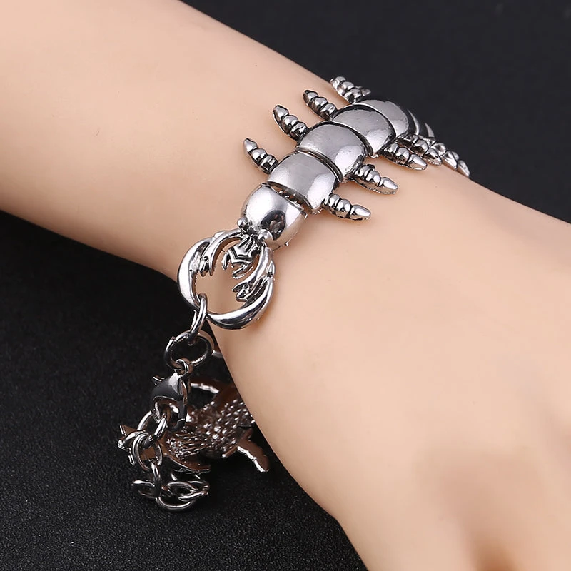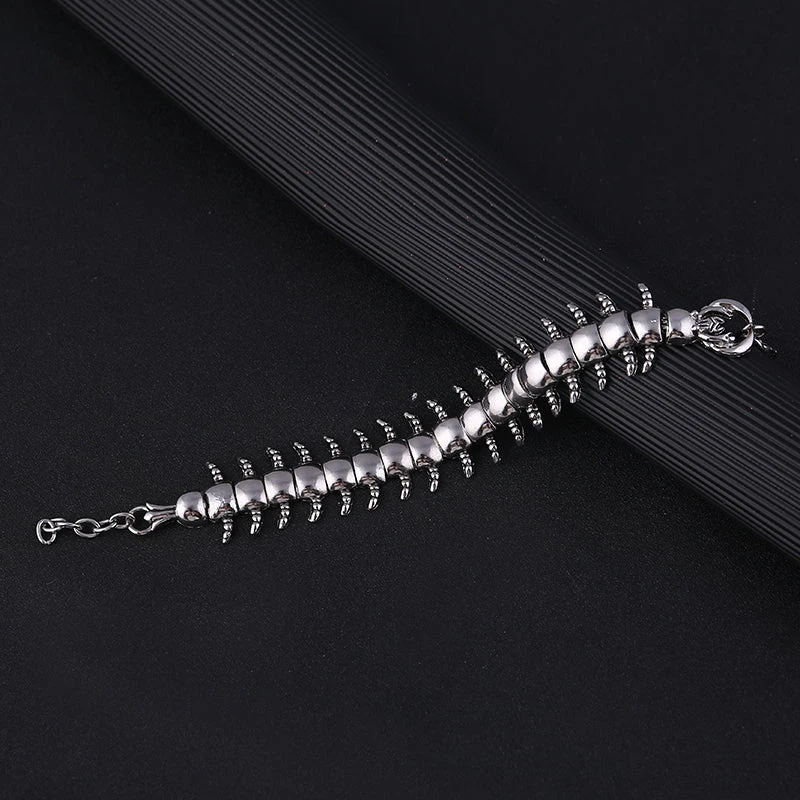 This eyecatching silvertone bracelet features the body of a centipede with head at one end and tail at the other.