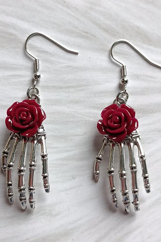 Dark Red Rose Skeleton Earrings.