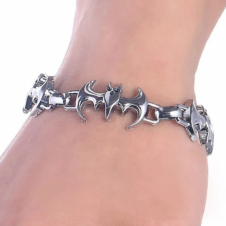 This eyecatching silvertone bracelet features five bat links with connecting links between them.