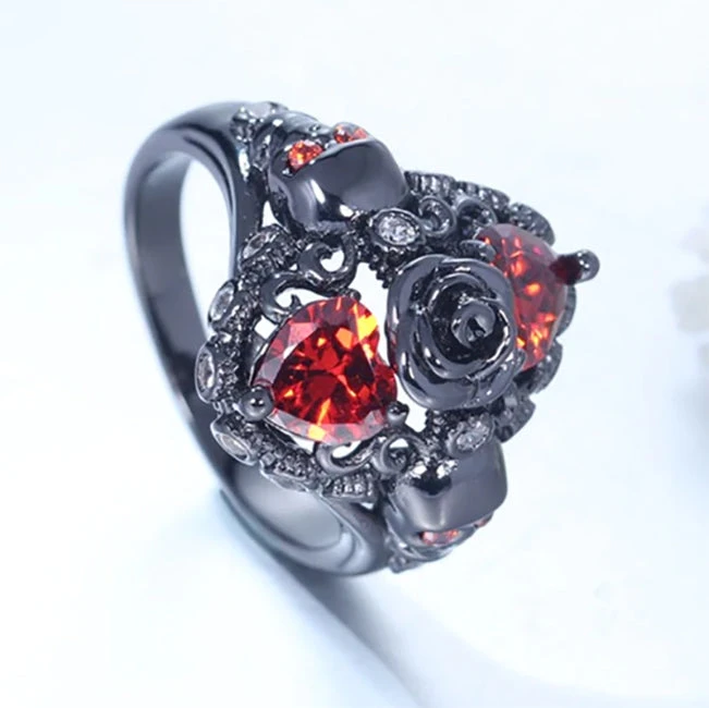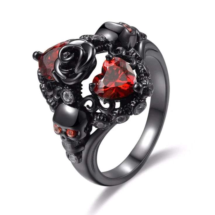 This beautiful gothic ring in a black gold finish features a central rose, crystal eyed skulls to each side and two hearts in red cubic zirconia.