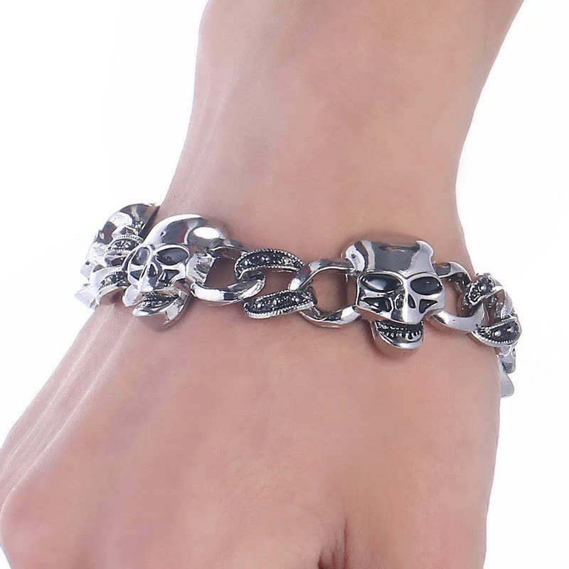 This eyecatching silvertone bracelet features five skull links with patterned connecting links between them.