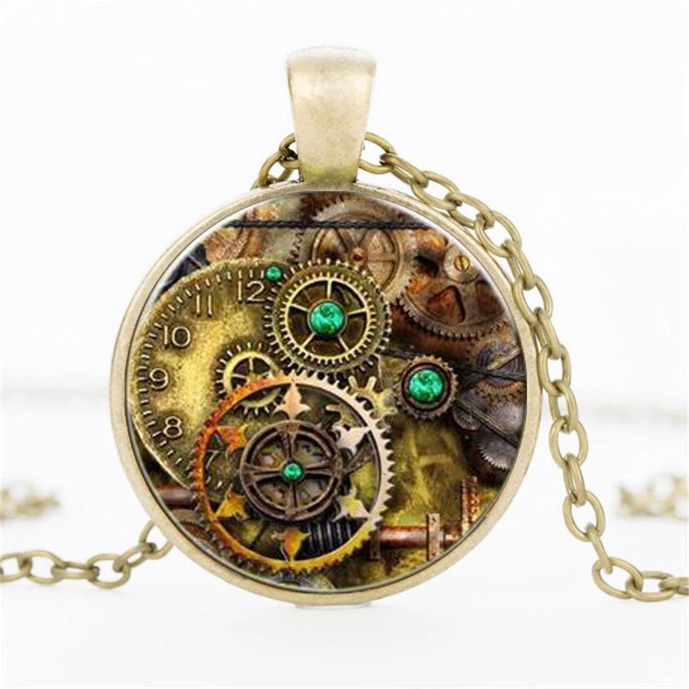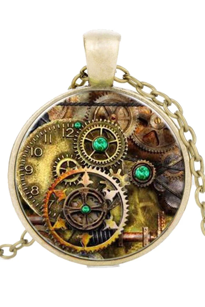This antique bronze tone pendant with 25mm glass cabochon setting depicting an image of clockwork and gears hangs from a 20 inch bronze tone chain.