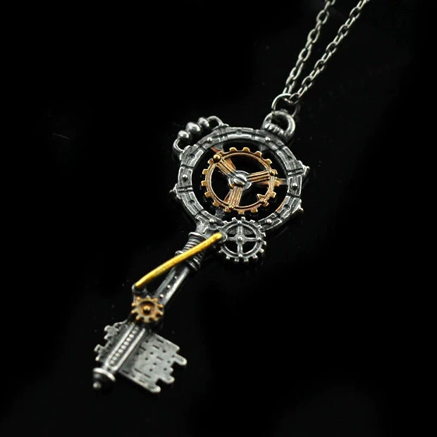 Steampunk Key Necklace in gunmetal silvertone with copper and bronze tone accents and gear detail.