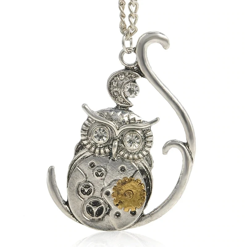 Silver tone Steampunk Owl necklace with mechanical gears in his stomach and diamante eye detail and moon over it’s head.