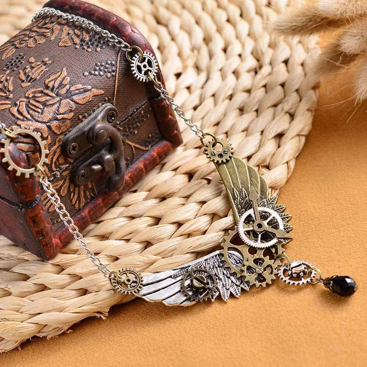 Beautiful Steampunk Wings Necklace with silver and bronze tone gears, clock hands and black faceted drop bead.