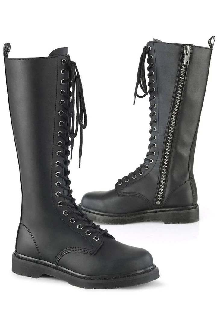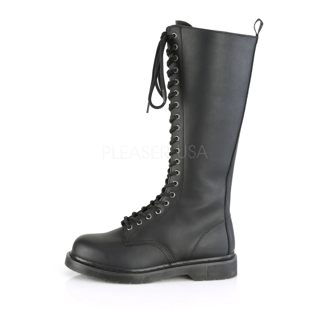 1 1/4″ (32mm) Stacked Flat Heel 20-Eyelet Lace-Up Knee High Unisex Vegan Boot with Back Pull-Tab, Full Length Inside Zip Closure.