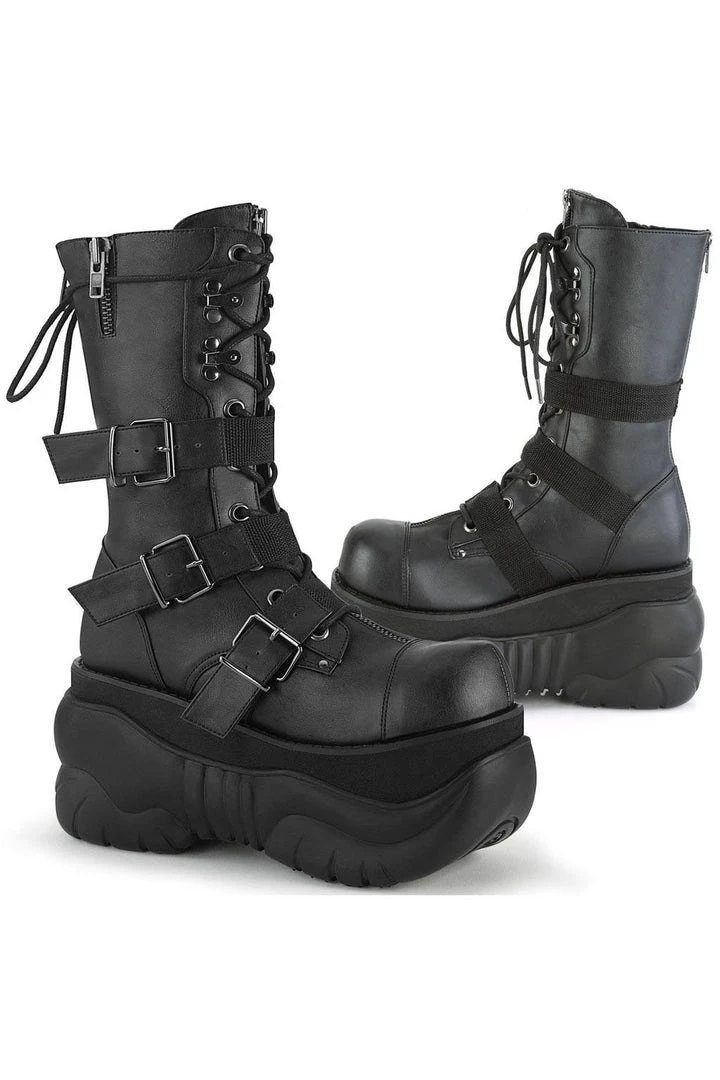 4″ (102mm) Platform Lace-Up Mid Calf Boot Featuring 3 Nylon Buckle Straps and Ornamental Zipper Details on the Tongue and Outer Shaft, Metal Back Zip Closure.