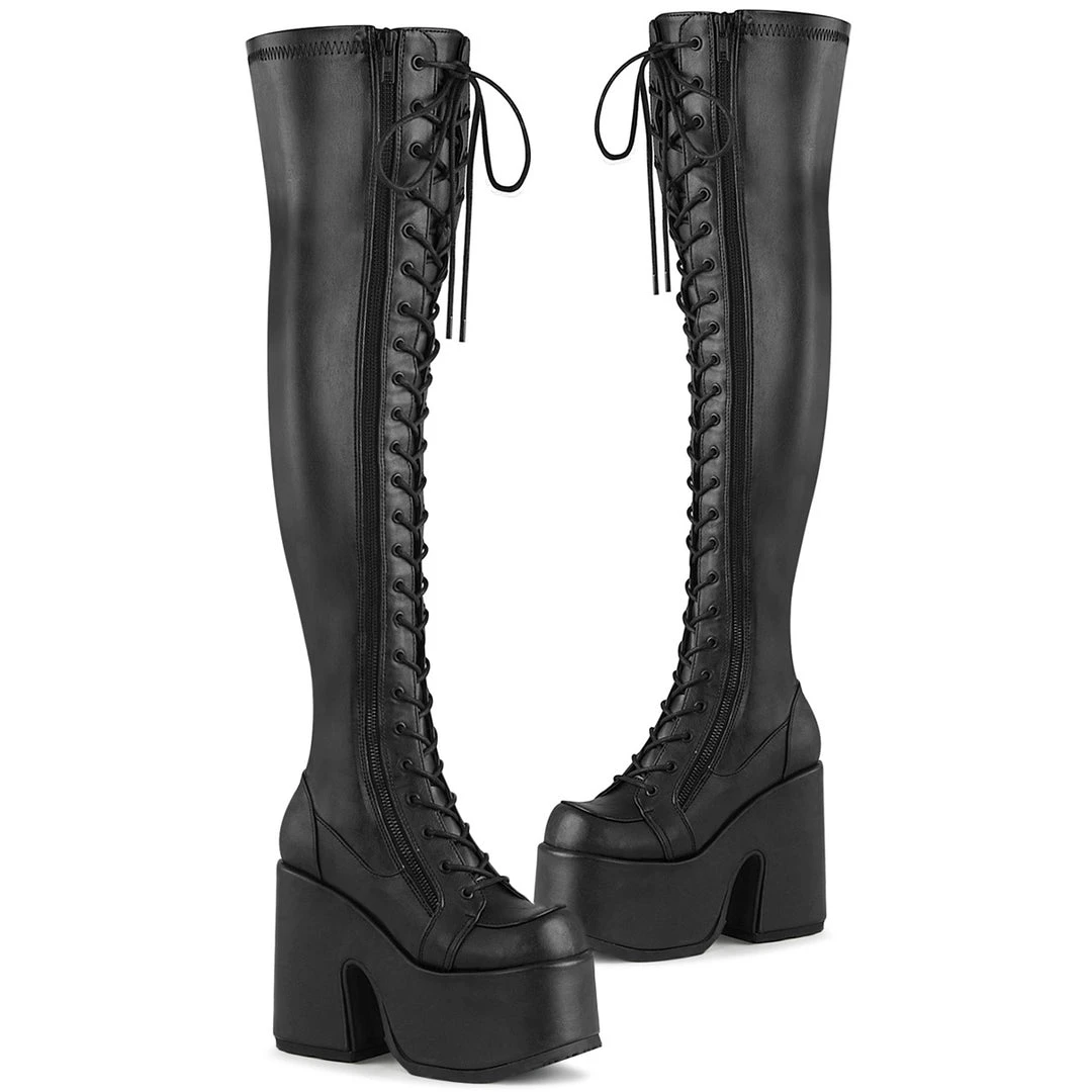 5″ Chunky Heel, 3″ Platform Lace-Up Stretch Thigh-High Boot, Full Length Outside Metal Zipper.