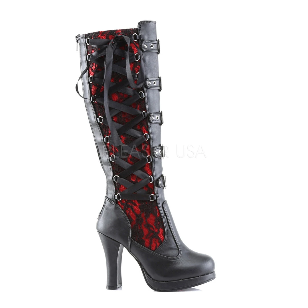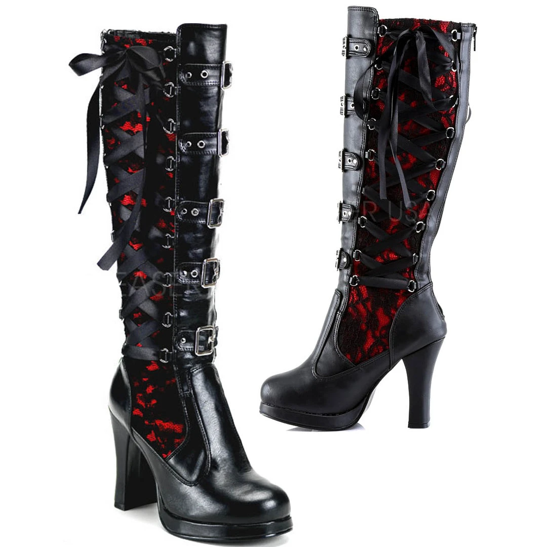 Demonia Ladies Crypto 106 Black Knee Boots with Red Lace Panels.