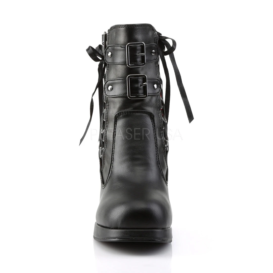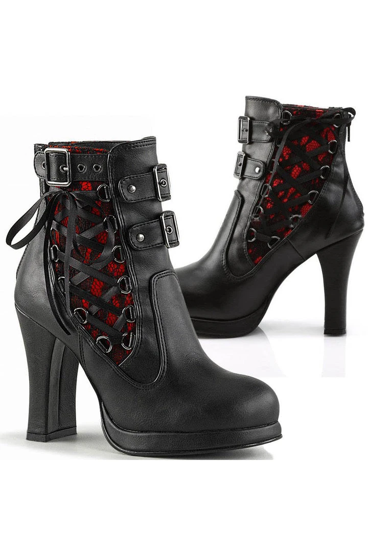 Demonia Crypto Black Gothic Boots. Black leather effect boot with four inch platform heel and platform sole. Two front buckle straps and one side buckle strap, side corset lacing and red contrast side panel with black lace overlay.